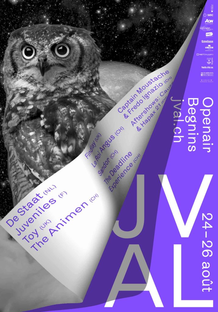 Spécialisée dans le développement de nouvelles méthodes de visualisations, l’agence a voulu créer une affiche en mouvement, étendant l’idée émise en 2016. Ainsi, à chaque fois que les supports le permettront, l’affiche sera animée avec une première couche qui s’envolera pour laisser place à la programmation du JVAL. Autre particularité de l’affiche, elle se déclinera en plusieurs versions qui auront toutes une chouette nocturne différente, clin d’oeil aux multiples styles de rock qui résonneront lors de cette 13ème édition du JVAL Openair.