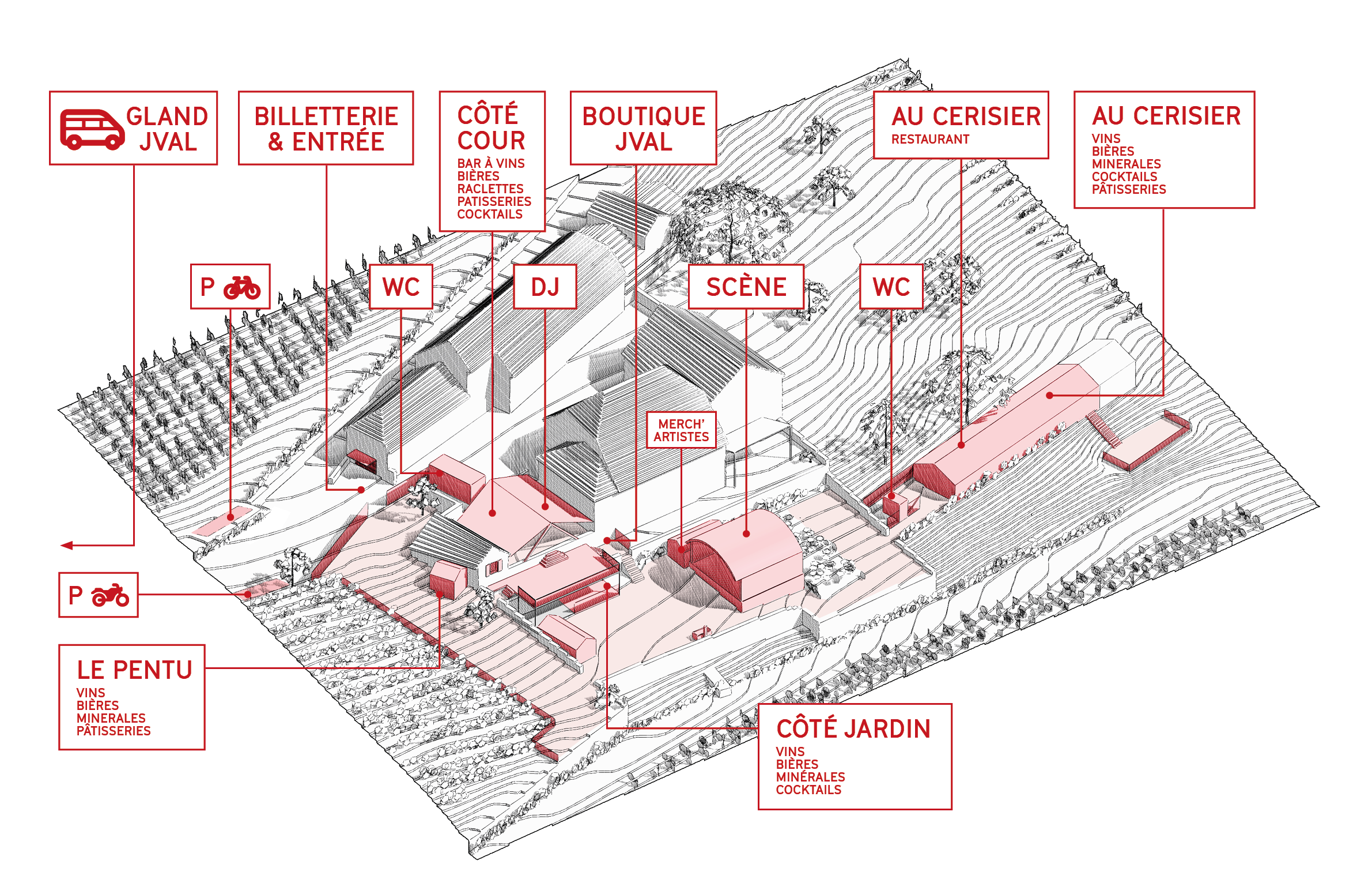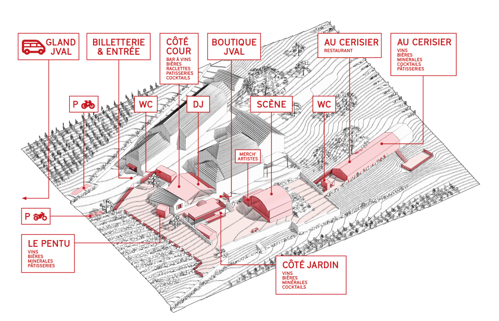 Si les festivaliers ne peuvent pas venir en train et en bus, des places de parking sont organisées le long des vignobles situés en contre-bas du festival. Merci de suivre les indications et ne pas se garer de manière sauvage. Le chemin menant directement à l’entrée du festival est interdit au parking.