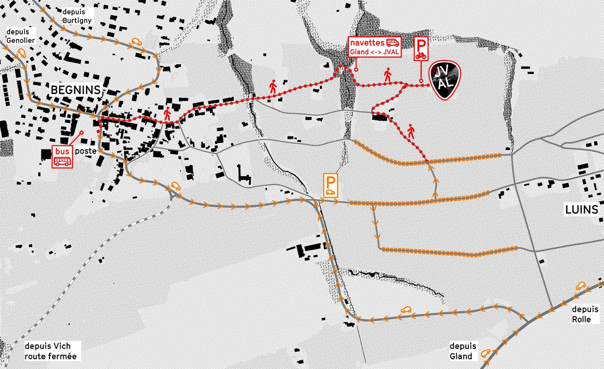 Un service de navettes gratuites, organisé avec CarPostal, est à disposition. Les navettes circulent entre la gare de Gland et le festival toutes les 30 minutes.