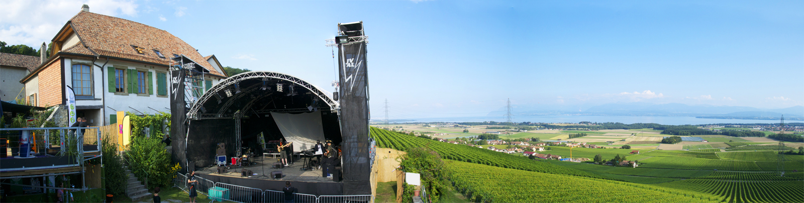 Avec sa vue à 180° sur le lac Léman et sur les vignes de La Côte, les terrasses du domaine de Serreaux-Dessus peuvent accueillir 550 festivaliers dans son écrin enchanteur. Plusieurs espaces couverts sont installés et peuvent accueillir les festivaliers en cas de mauvais temps.